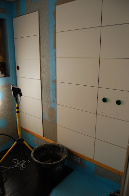 Nå begynner vi å få et inntrykk av hvordan badet vårt blir! Store fliser ser ut til å være veldig lette å legge for de fyker jo opp på veggen i full fart! Nå skal det sier at samboeren har valgt å begynne med det lette der han nesten ikke behøvde å kappe da - så jeg regner med at det blir en del flere banneord å høre når han skal begynne på nisjene mine! :)